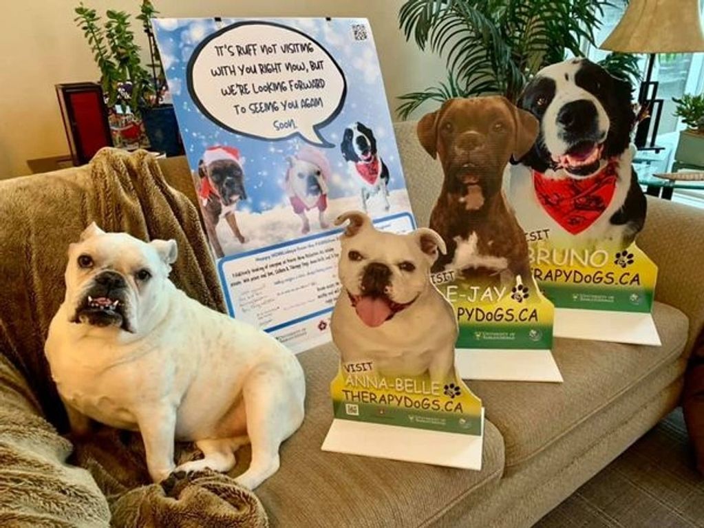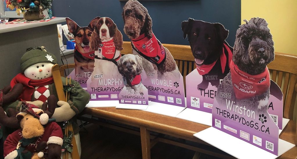 Due to the COVID-19 pandemic, the St. John Ambulance Therapy Dogs are not currently visiting in-person in the province's hospitals. Connections are being made virtually through our website, and cardboard statuettes are now greeting patients until in-person visits can resume.